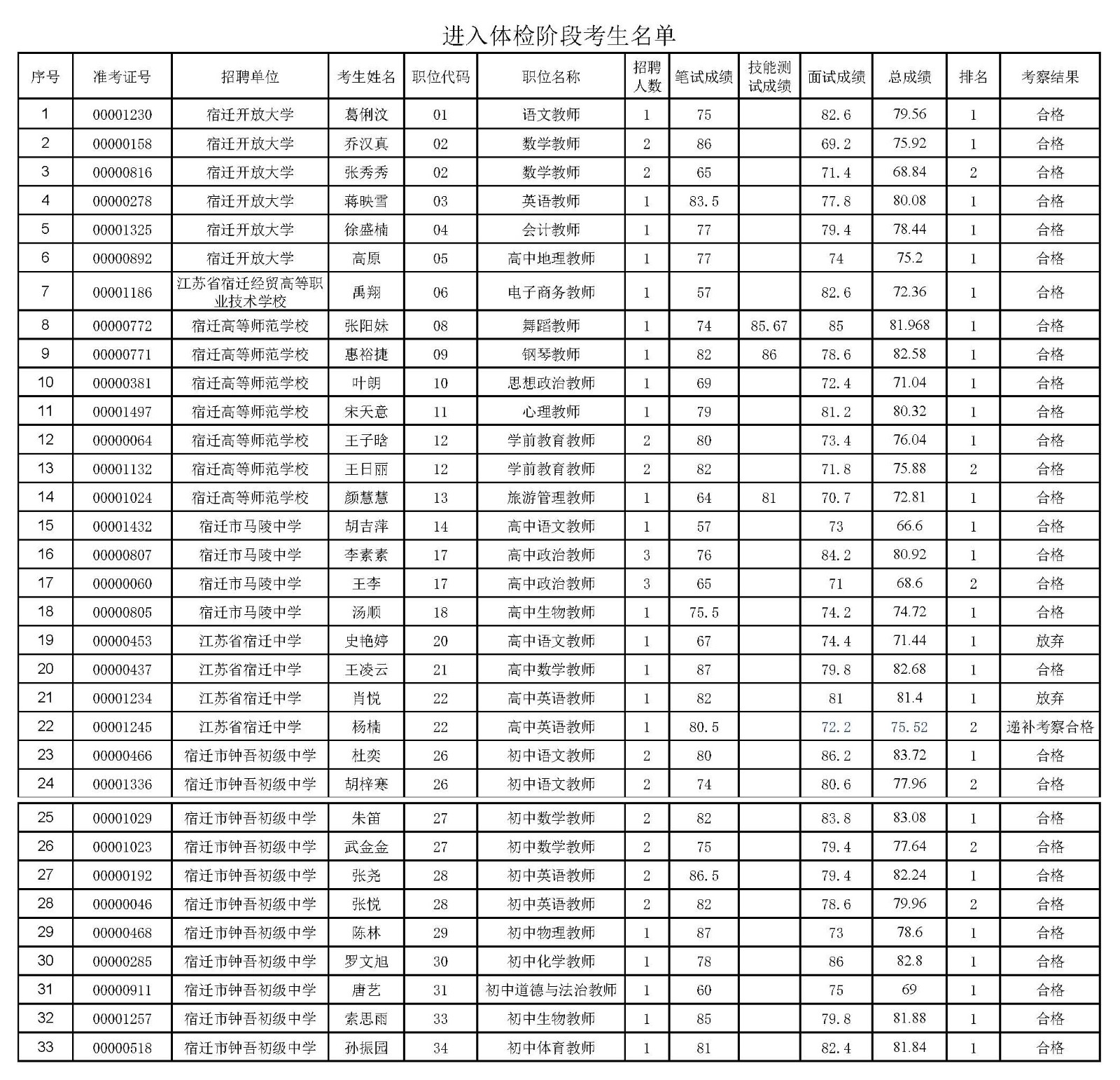 根据《宿迁市2021年市直教育系统第一批公开招聘公告》要求,现将考察合格进入体检阶段的考生名单予以公布。请进入体检阶段的考生按以下通知做好相关准备工作。